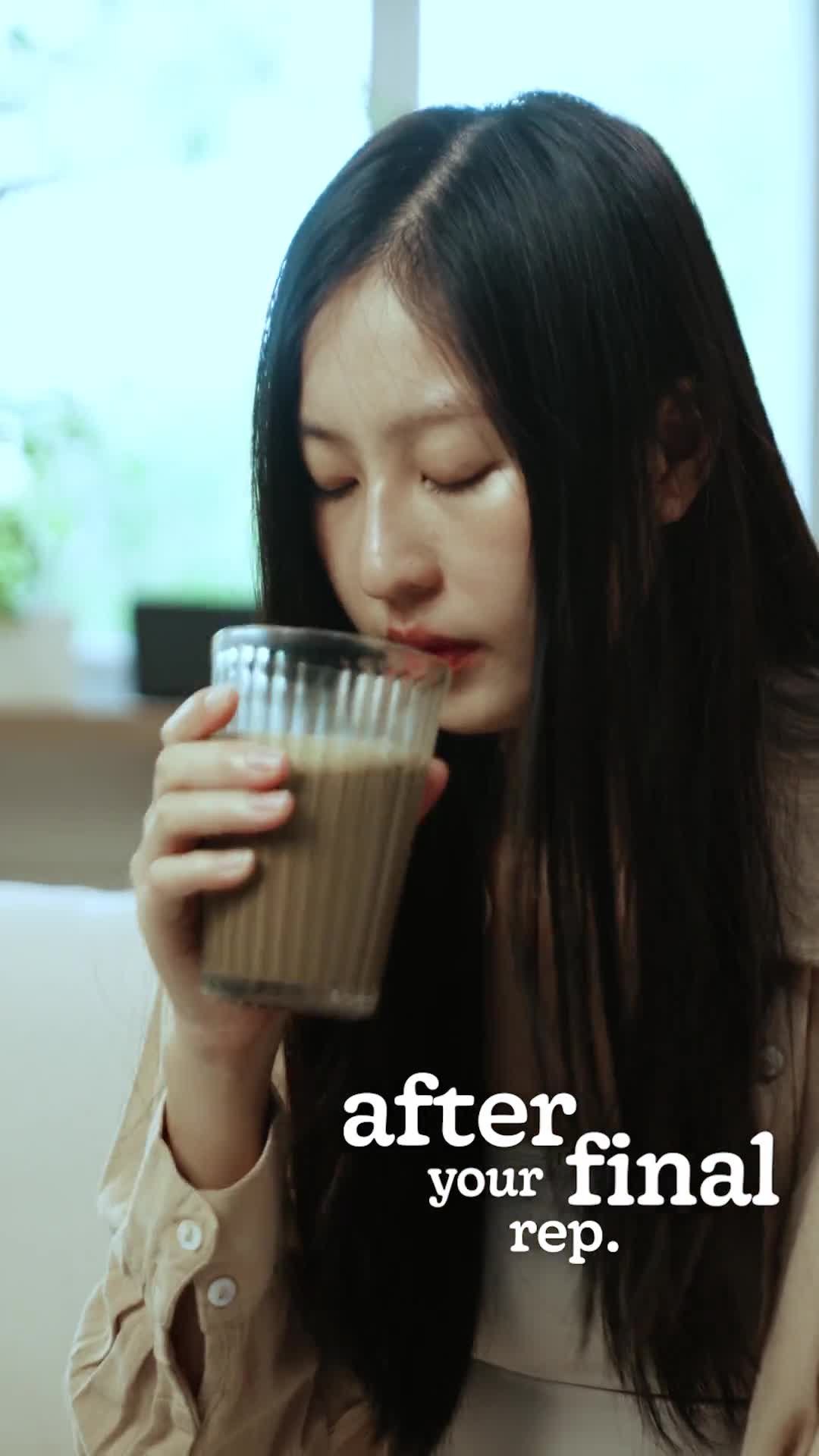 A fitness enthusiast finishes a home workout. She reaches for her bottle, pour in Matcha Espresso, stir, sip. Next, she flows into a quiet yoga stretch. She has a sip of Hojicha. The shift: from movement to mindfulness.